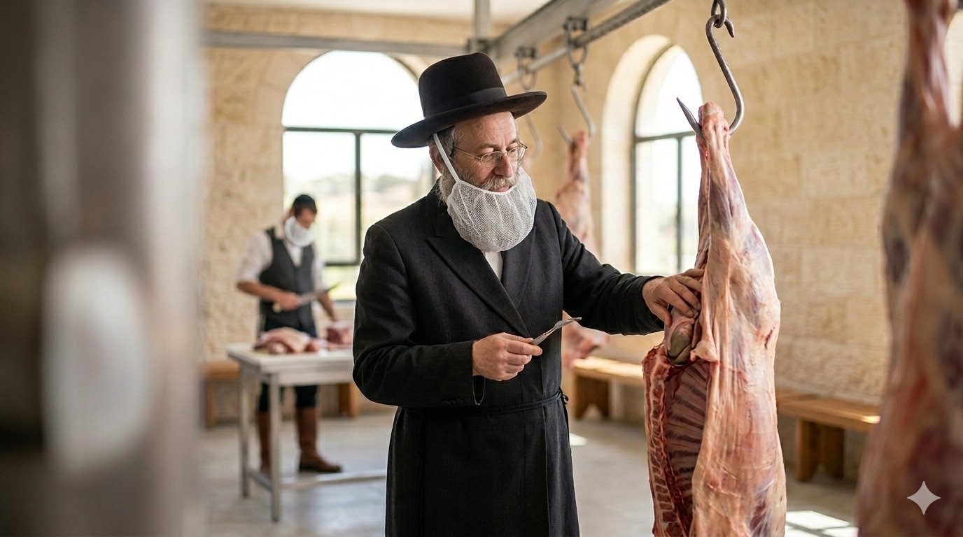 Em kashrut, animais terrestres devem ser abatidos por um especialista, o shochet, que realiza um corte rápido e preciso na garganta para drenar o sangue e, em seguida, inspeciona o corpo para sinais de doença ou lesões que tornariam a carne proibida. Embora o principal objetivo seja normativo-religioso, a inspeção detalhada da carcaça pode detectar anomalias que, em teoria, também seriam identificadas em inspeções veterinárias modernas.