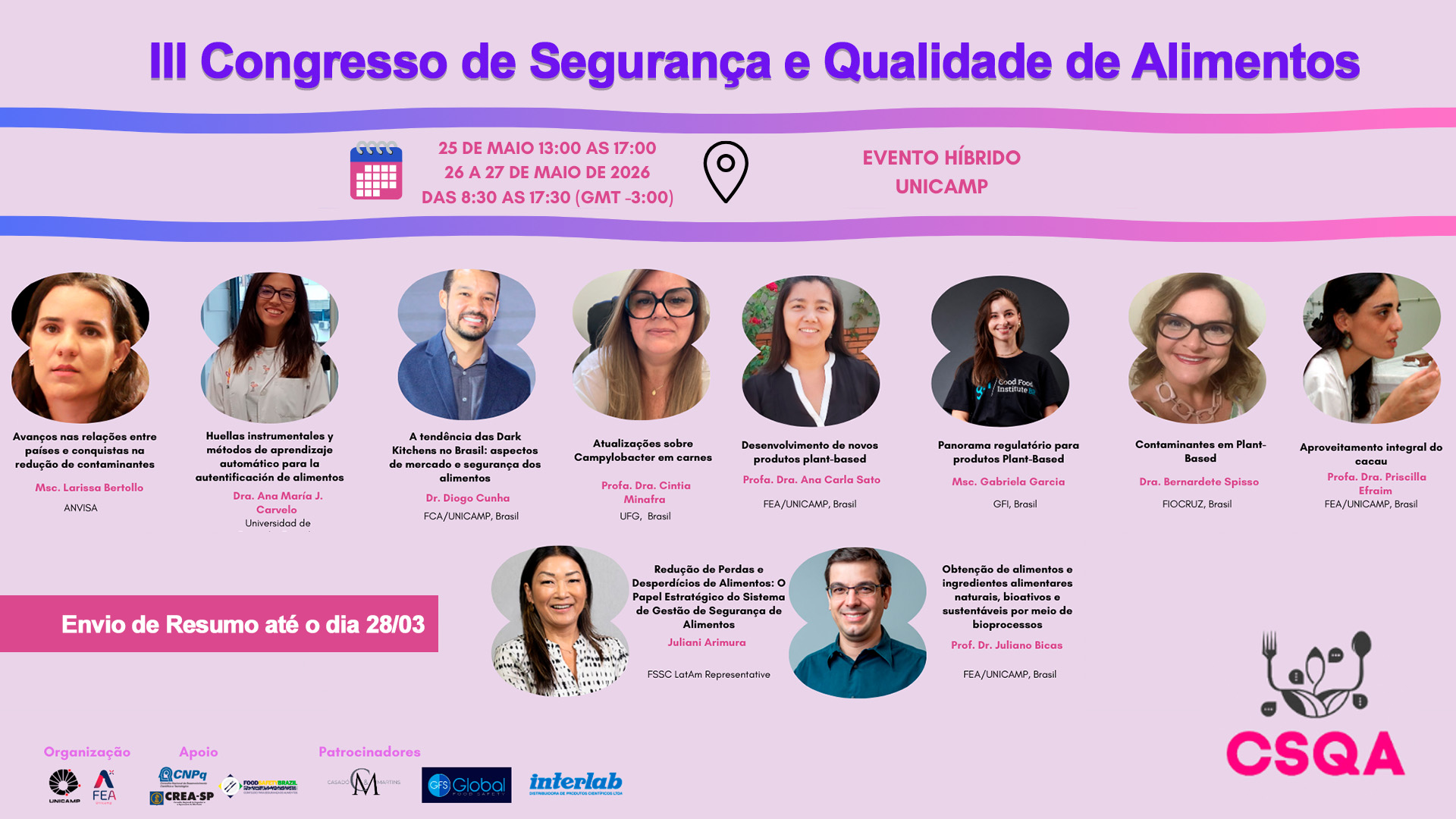 No período de 25 a 27 de maio a Faculdade de Engenharia de Alimentos da Unicamp entregará à comunidade acadêmica e profissionais conectados à produção de alimentos mais uma edição do Congresso de Segurança e Qualidade de Alimentos.